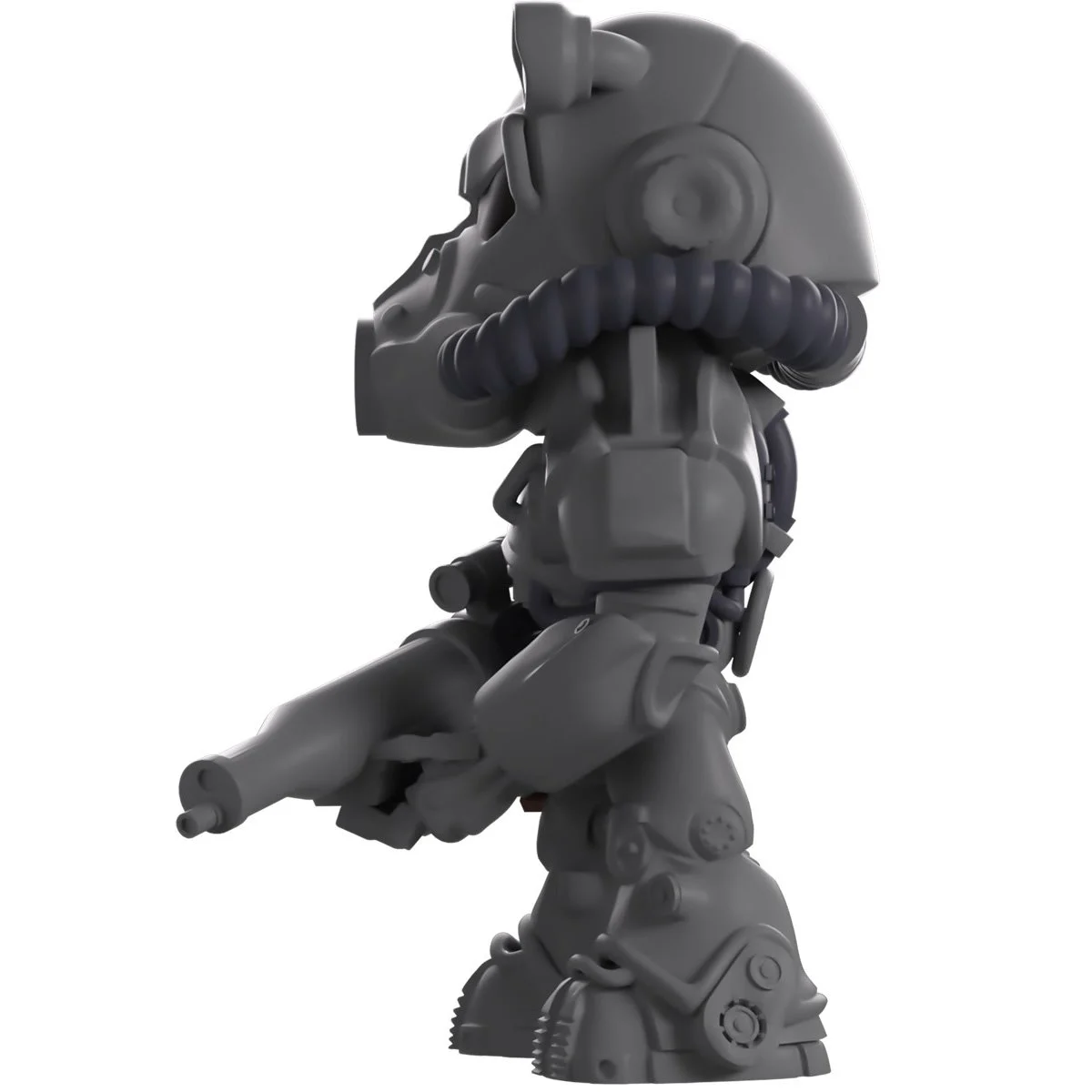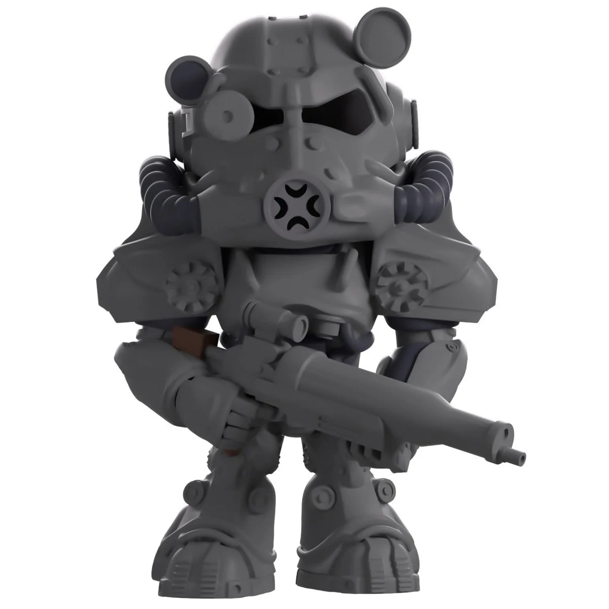 Well would you look who’s marched their way through the wasteland for their Youtooz debut! Standing at 4.3 inches tall holding a hefty assault rifle at the ready for whatever the wasteland may send their way, their helmet has a ventilation pipe running around either side along with a slight that flips over the visor. With thick pauldrons jutting out from a heavily plated chest as the back of their armour has a wheel lock used to enter it, their feet widen at the bottom to make sure they can withstand any explosion. The exterior of their packaging sees them staring forward in front of a vast barren desert. The interior is then a pale blue with the ‘Vault 101′ logo on its back while the protective sleeve is a desolate wasteland covered in Vault Boy’s as the figure can be seen through the large clear window at the packaging’s front.